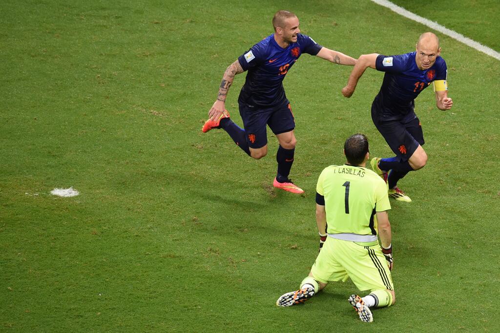 Robben struck the first blow as he tied Spain’s defensive duo in knots after being played in superbly again by the brilliant Blindt before tucking the ball past the once again helpless Iker Casillas to make it 2-1 to the Dutch. Stefan de Vrij then made up for his earlier indiscretion as he nodded home a Wesley Sneijder free-kick at Casillas’ back post. The only blight on this performance by the Dutch might be that Van Persie’s contribution in challenging Casillas before this goal was scored arguably had a very big part to play in the goal – the referee didn’t see it that way however and Holland’s third goal stood.
