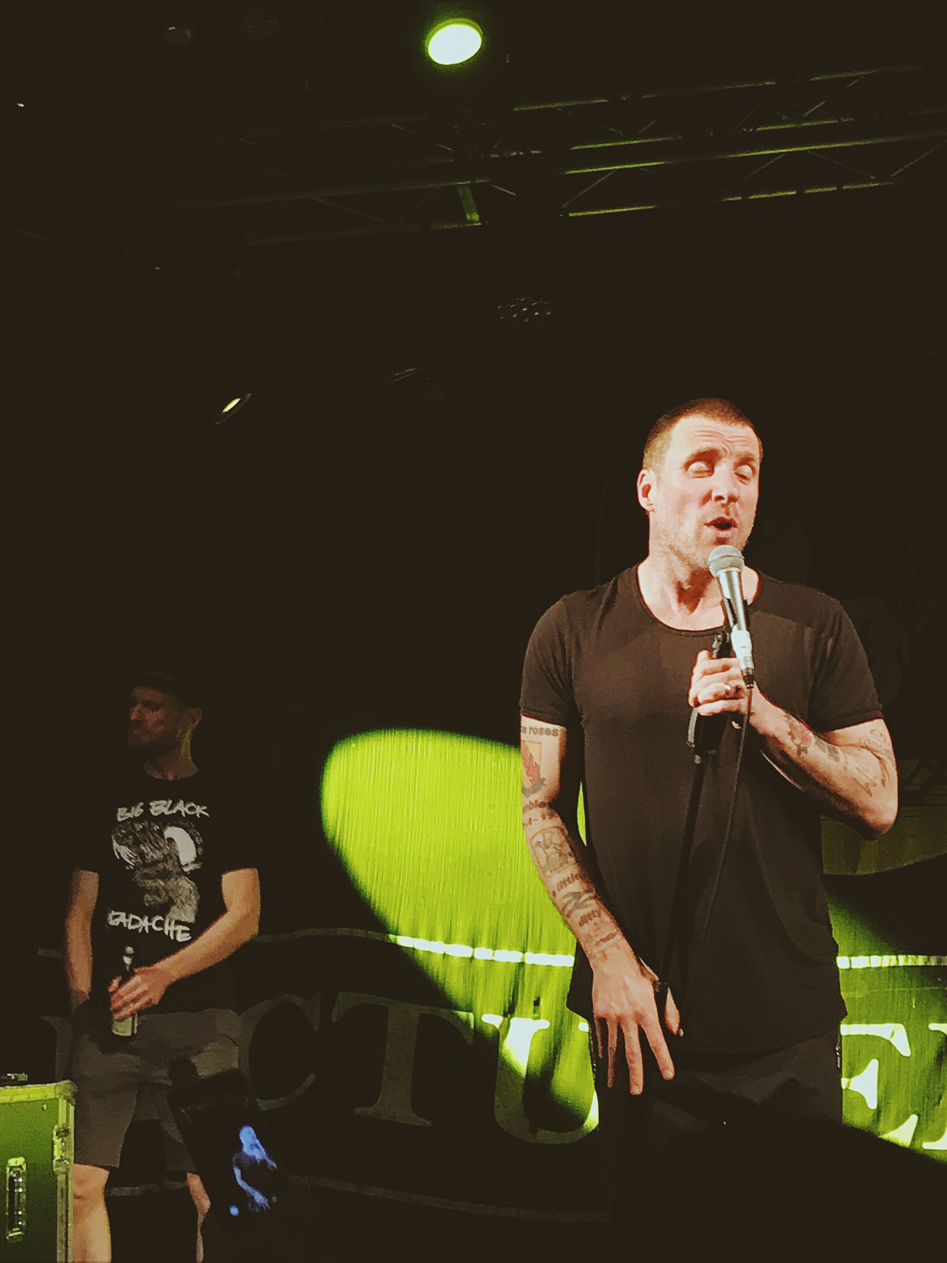 They open with “Into the Payzone”, a plodding number that builds up the tension for the manic speed of following track “Flipside”. Whilst they are still something of an “leftfield” or “alternative” act, it is clear that they have picked up a few attributes of more mainstream bands. “BHS” “TCR” and “Jobseeker” all have sing-along choruses belted back at the band, and the pulsating bass of “Kebab Spider” results in a surprising amount of “proper” dancing from the crowd which continues throughout the evening. Obviously there is a strong punk element to much of the groups music and live performances, and there is no shortage of that on display (at one point security make themselves known in the pit during a particularly rough “Jolly Fucker”), but there are parts of the evening where the audience seemed to be moving as thought they were at something resembling a Stone Roses dancefloor; which is brilliant.
