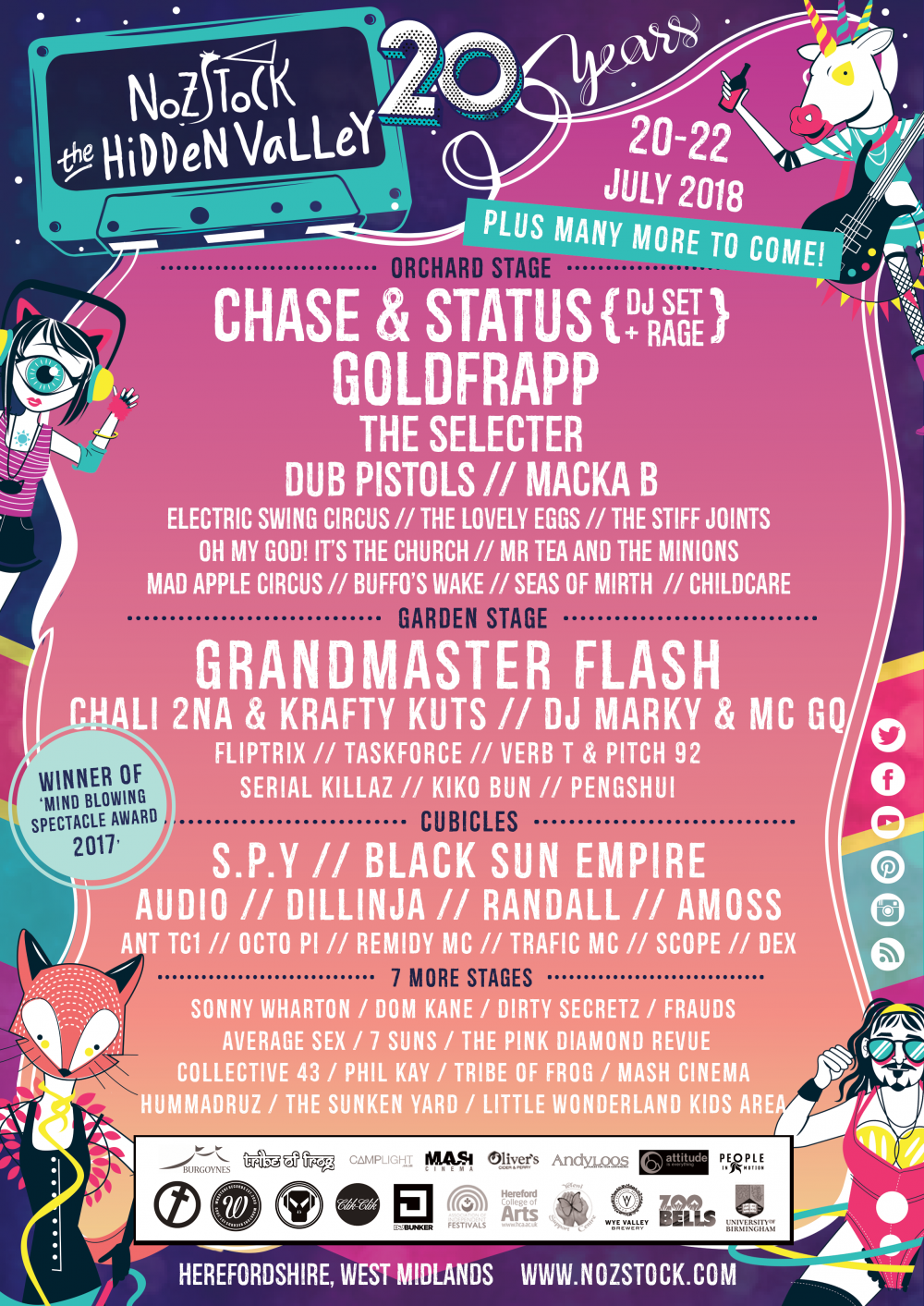 Taking place this year from Friday 20th to Sunday 22nd July 2018 at Rowden Paddocks in Herefordshire, it offers a mix of live music and DJ sets with its first lineup announcement. Goldfrapp headline the main Orchard stage, and they will be joined by the likes of Dub Pistols, The Selecter, Electric Swing Circus, the Lovely Eggs, Oh My God! It’s the Church!, Catholic Action and Mad Apple Circus. That’s two different ‘circus’ bands. In terms of DJ sets, the big names this year are undoubtedly Chase & Status. In addition, Nozstock has landed Grandmaster Flash, Chali 2na & Krafty Cuts, S.P.Y., Black Sun Empire, Fliptrix, Pengshui, Dillinja and AMOSS. More names will be announced on both fronts in due time.